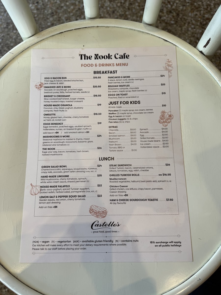 The menu at The Nook Cafe is a carefully curated selection that highlights the best of all-day breakfast, brunch, and lunch options. One must-try dish is their delicious Corn Fritters topped with smoked salmon, wilted spinach, poached eggs, and rich hollandaise, all for just A$26.00. For those after a classic twist, the Brekkie Burger showcases a perfect combination of a fried egg, bacon, and hash brown, all snugly enclosed in a seeded brioche bun and finished with jack cheese and relish—satisfying at only A$17.50.